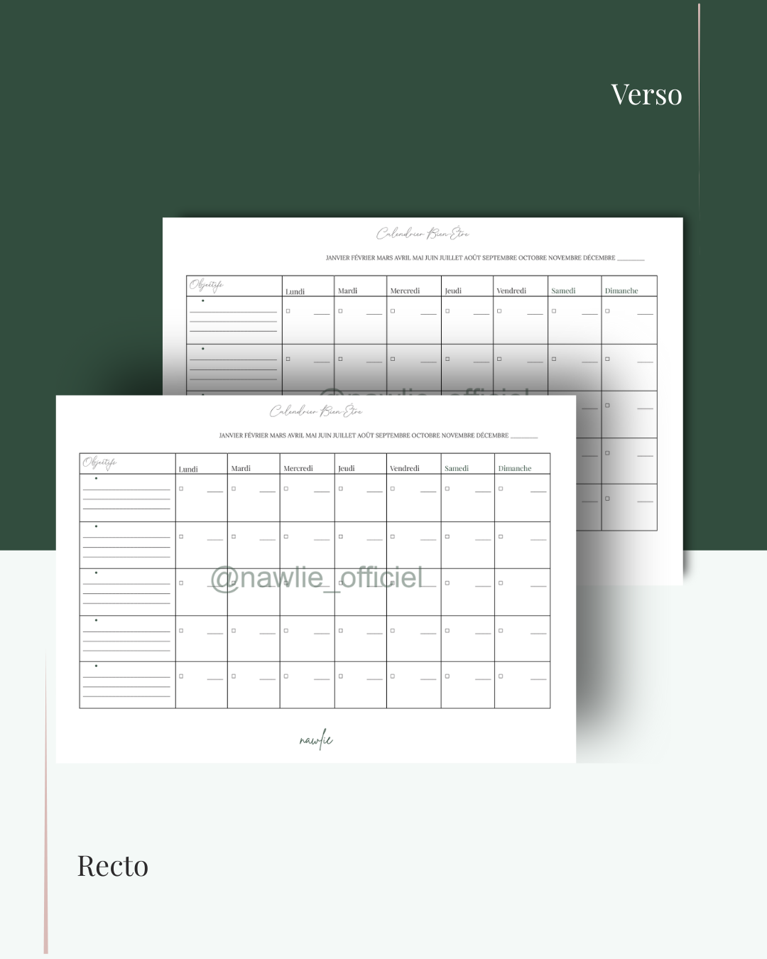 - Une grille hebdomadaire (lundi au dimanche) avec cases à cocher pour suivre vos journées.
